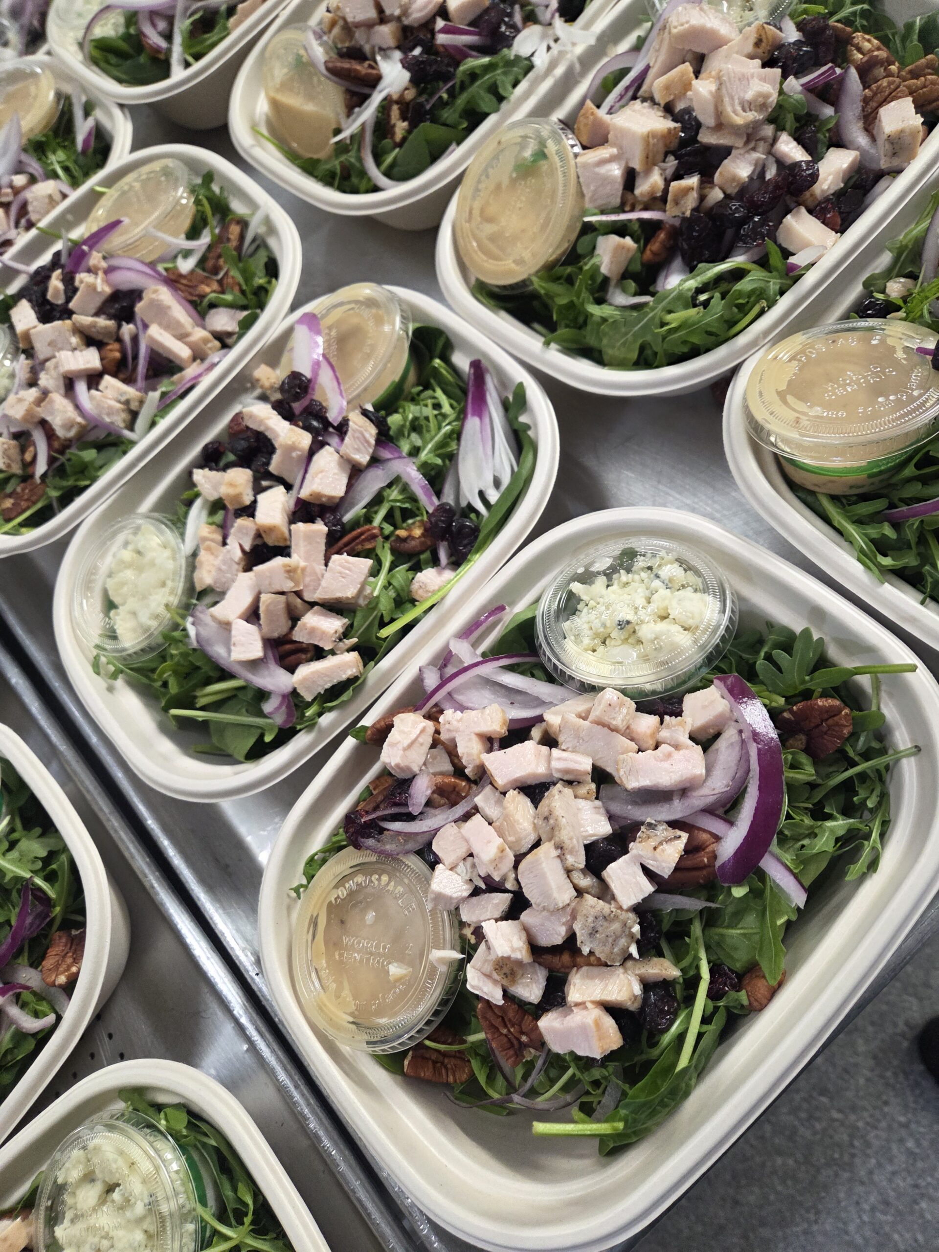 Salad: Arugula, baby spinach, sliced red onions, craisins, roasted pecans, blue cheese crumbles. Dressing: Kewpie Sesame Dressing: Canola oil, water, soy sauce (water, soy, wheat, salt), brown sugar, sesame seeds, distilled vinegar, salt, yeast extrat, natural flavors, egg yolk, xanthan gum. Minatos Lilikoi Dressing: Soybean oil, water, sugar, mayo (soybean oil, egg, water, vinegar, salt, sugar, lemon juice), vinegar, lilikoi puree, sea salt, black pepper, mustard, citric acid. Sous Vide Chicken Breast (if added on).