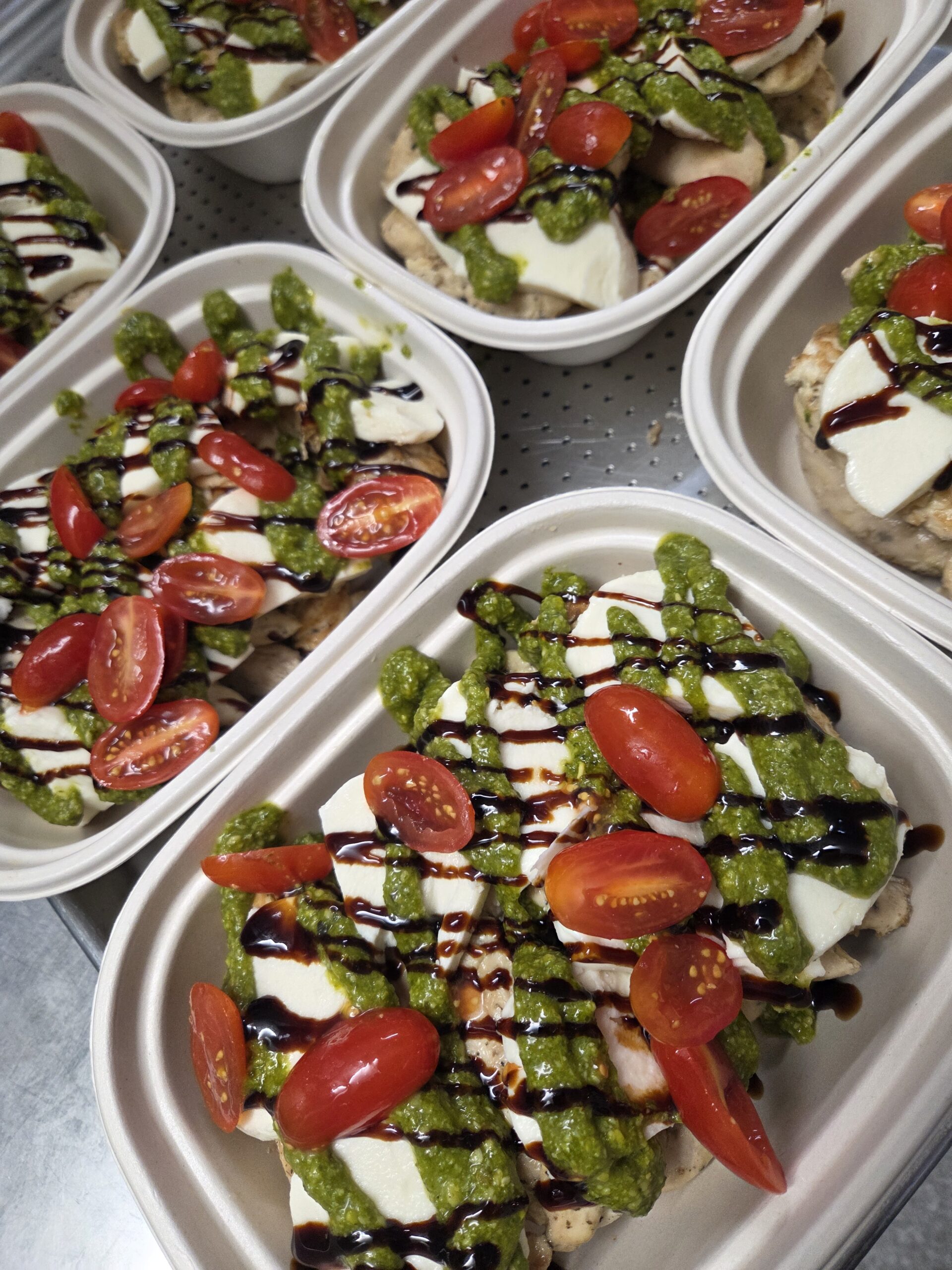 Serving size: 4 oz (about 2 pieces of chicken and toppings) Chicken – chicken tenderloins, olive oil, lemon, Italian seasoning, fresh mozzarella cheese, pesto (basil, sunfllower oil, salt, parmesan cheese, pine nuts, olive oil, pecorino romano, garlic, black peppper, balsamic vinegar, sugar. Grape tomatoes.
