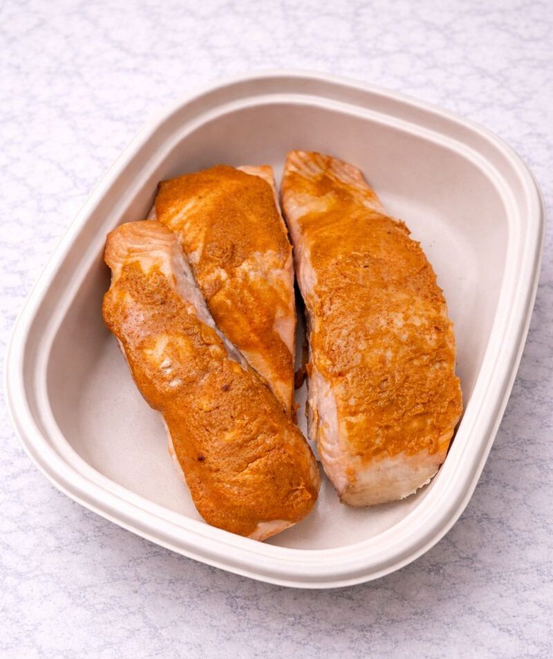 (Serving Size: 4 oz, approx. 1 filet) Salmon, olive oil, lime juice, Dijon mustard, sugar free maple syrup, garlic powder, paprika.