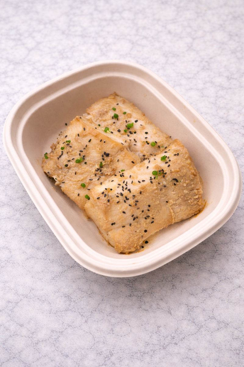 (Serving Size: 4 oz, approx. 1 filet) Cod, liquid aminos, miso paste, sugar free maple syrup, garlic, ginger, sesame seeds.