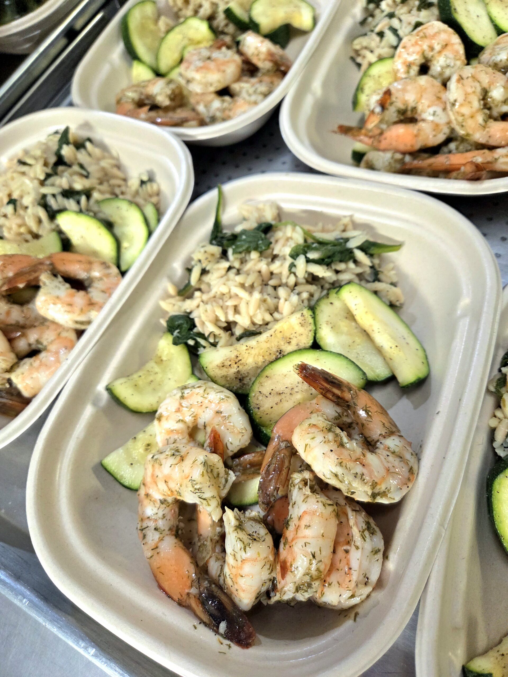 Shrimp – shrimp, olive oil, lemon juice, garlic, pepper, dill. Orzo – onion, garlic, lemon, olive oil, spinach, oregano, pepper, garlic salt. Zucchini – garlic powder, pepper.